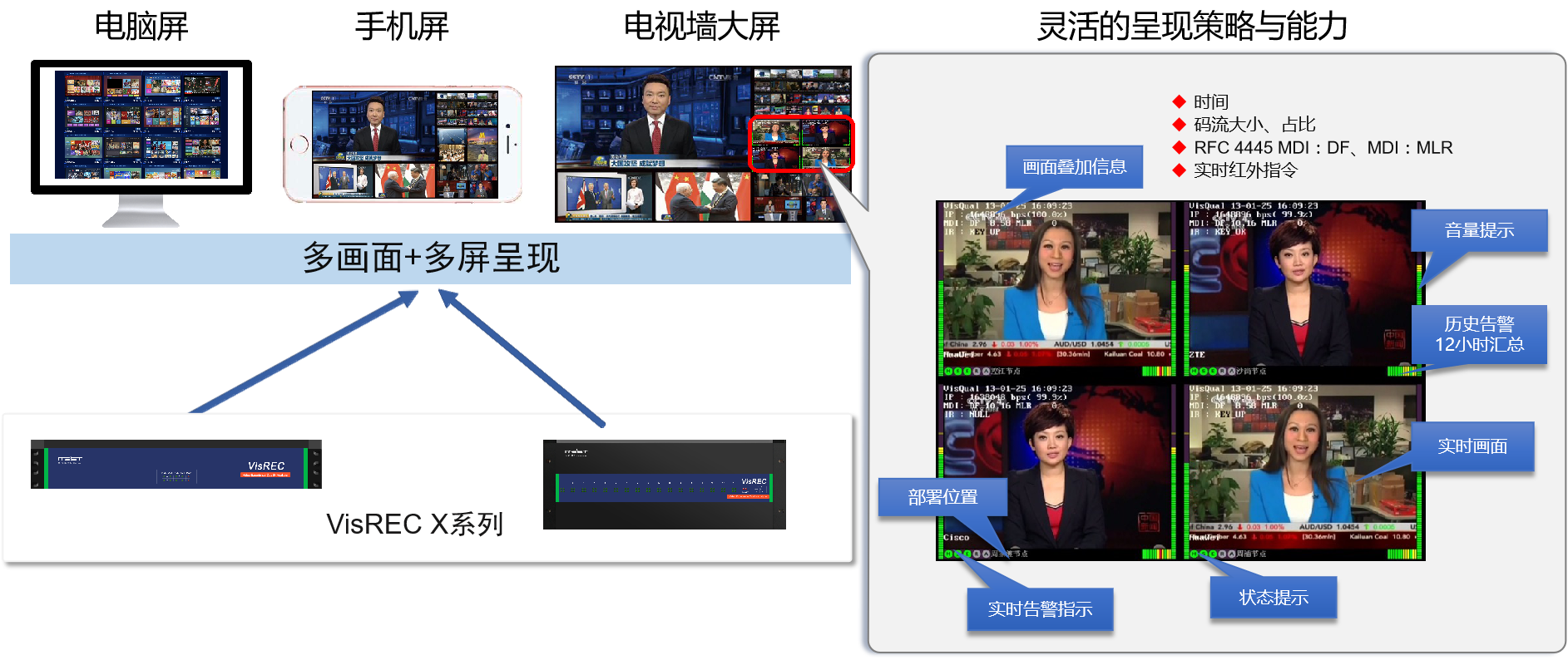 艾策發布的高密度低功耗4K超高清監測監管解決方案支持多屏呈現方式,可應用在IPTV大屏媒體監測監管、城市融媒體、互聯網直播、5G+4K+VR等多種場景的監測監管,對IPTV/OTT電視提供端到端監聽監看完美覆蓋。