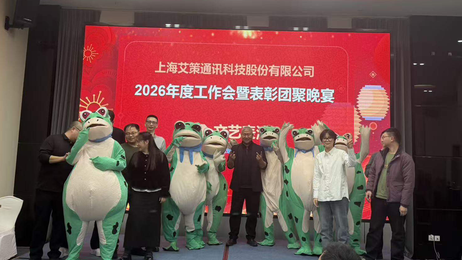 1月18日,成都年會迎來重頭戲,300平的大宴會廳內(nèi)燈火璀璨、暖意融融,“2026年度工作會暨表彰團(tuán)聚晚宴”在此隆重舉行。整場晚會環(huán)節(jié)緊湊、精彩紛呈,“寄語2026”道出了艾策人對未來的期許,現(xiàn)場紅包雨點燃了全場的熱情,五個等次的抽獎環(huán)節(jié)懸念迭起、驚喜不斷。晚會特別為2025年度內(nèi)結(jié)婚的同事送上祝福,為當(dāng)月過生日的同事共慶生辰、分享甜蜜蛋糕,每一個細(xì)節(jié)都彰顯著艾策大家庭的溫暖。文藝表演環(huán)節(jié)更是高潮迭起,青蛙裝舞蹈串燒憨態(tài)可掬、趣味十足,引得全場歡笑連連;小品《總裁請就診》貼近流行元素、詼諧幽默,兼具觀賞性與時代特征;貴陽團(tuán)隊杜寬寬的吉他彈奏婉轉(zhuǎn)悠揚,用旋律傳遞深情;合唱《敬業(yè)陣線聯(lián)盟》活力滿滿,唱出了艾策人的敬業(yè)擔(dān)當(dāng);研發(fā)部龍哥的獨唱《槐蔭開口做大媒》韻味悠長,驚艷四座,贏得陣陣掌聲,為整場晚會增添了別樣風(fēng)情。